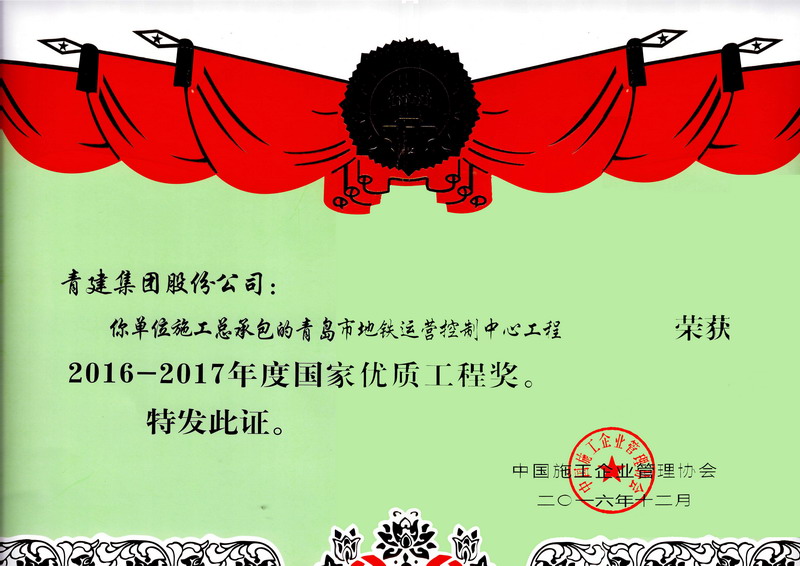 From December 10 to 12, the Conference on Exchange of Quality Management Experiences by Construction Enterprises 2016 was held in Xiamen, at which the first batch of national high-quality engineering award in 2016-2017 was awarded. Two of the projects undertaken by CNQC, Qingdao Subway Operation Control Center and Qingdao Ningxia Road Primary School, won the prize, and up to now, the company has won eleven such prizes for its outstanding work.