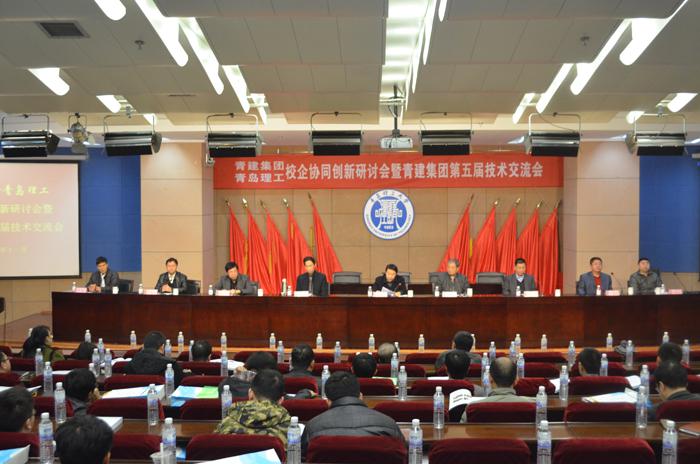 2014年11月28日,青建集团-青岛理工校企协同创新研讨会暨青建集团第五届技术交流会在青岛理工大学学术报告厅隆重召开。中国绿色建筑委员会主任王有为、中国建筑科学研究院地基所总工刘金波等两名国内知名专家应邀出席本次会议并做专题报告。青岛理工大学副校长赵铁军、国清控股集团副总裁张同波出席会议并分别致辞。集团总部相关部门、所属单位技术部门、项目部工程技术人员以及青岛理工大学相关部门负责人及相关专业师生200余人参加了此次会议。