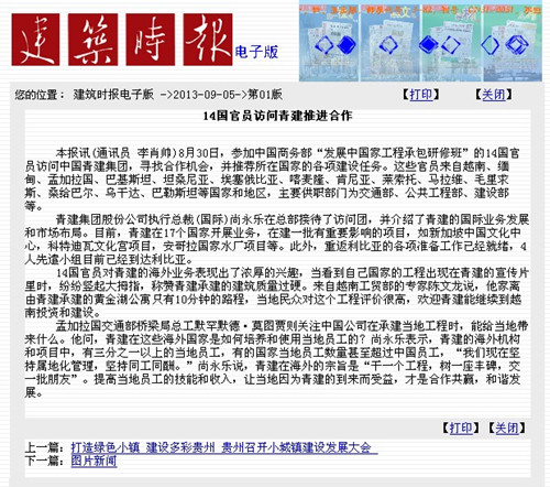 《中国建设报》、《建筑时报》报道14国官员访问青建