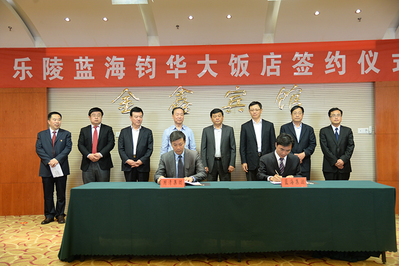 5月10日上午,乐陵蓝海钧华大饭店签约仪式在乐陵金鑫宾馆隆重举行。乐陵市委书记曲峰、市委秘书长刘德杰、副市长赵之达,国清控股集团董事局主席丁洪斌等领导出席签约仪式,乐陵市公安局、旅游局等13个部门的负责人参加签约仪式。签约仪式由乐陵市市委常委、市委秘书长刘德杰主持,青建地产集团总裁、青建八方实业有限公司董事长岳林涛与山东蓝海酒店集团总裁丁德杰分别代表双方企业签署了《乐陵蓝海钧华酒店合作协议》。