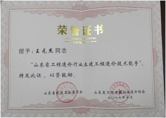 其中:王元杰获得“山东省工程造价行业土建工程造价技术能手”称号(全省第4名);