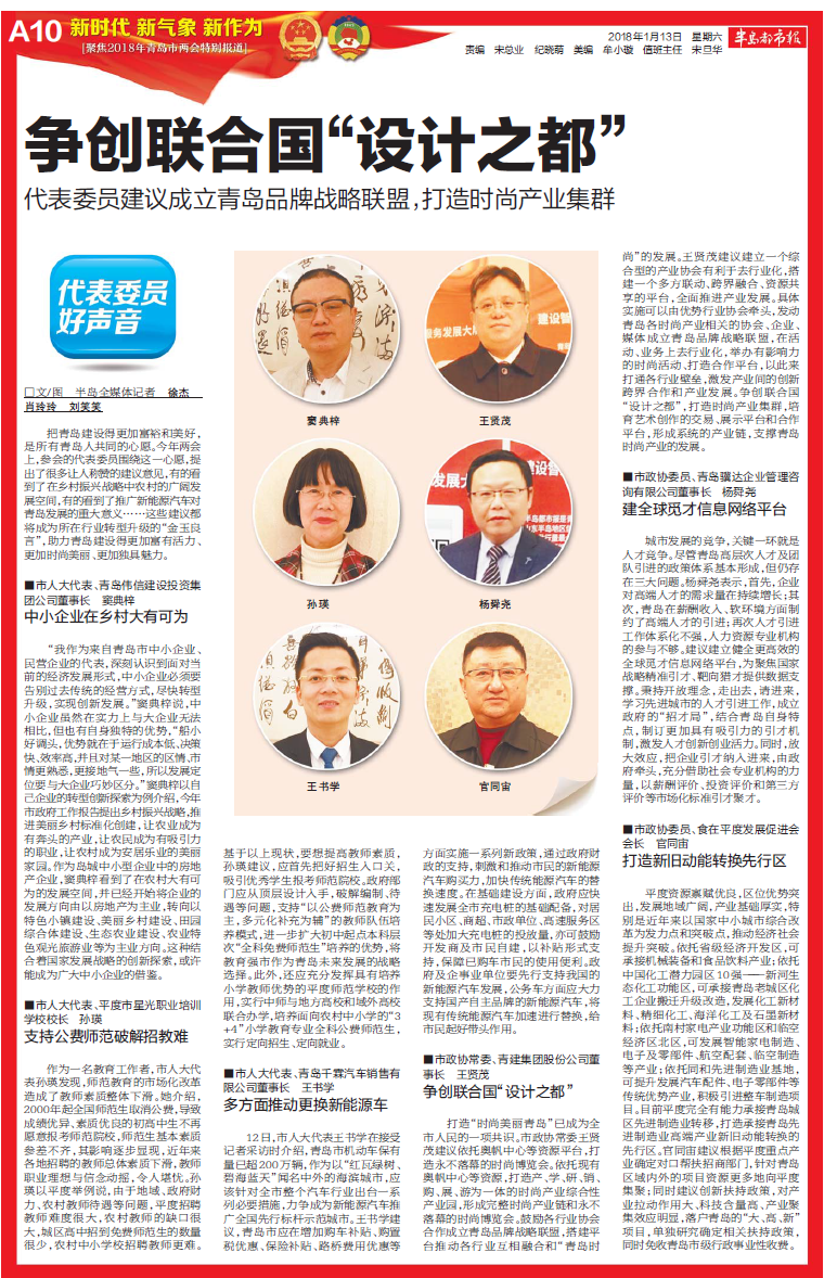 政府工作报告提出:推动城市现代化建设上新水平,需要将精品意识贯穿到城市建设的各领域。在接受青岛日报、半岛都市报和凤凰网采访时,王贤茂董事长为推动“美丽青岛建设”提出建议,他谈到:精品打造是建设“时尚美丽青岛”的题中要义,在这个过程中,要重视设计的作用;城市的新旧更替对城市环境带来的应该是加分效应而不是减分效应,这就必须提高对城市的整体规划能力,提升对城市功能和美丽度的设计能力。他建议:由优势行业协会牵头,发动青岛各时尚产业相关的协会、企业、媒体成立青岛品牌战略联盟,搭建平台推动各行业互相融合和“青岛时尚”的发展,打通各行业壁垒,激发产业间的创新跨界合作和产业发展;争创联合国“设计之都”,打造时尚产业集群,培育艺术创作的交易、展示平台和合作平台,形成系统的产业链,支撑青岛时尚产业的发展。
