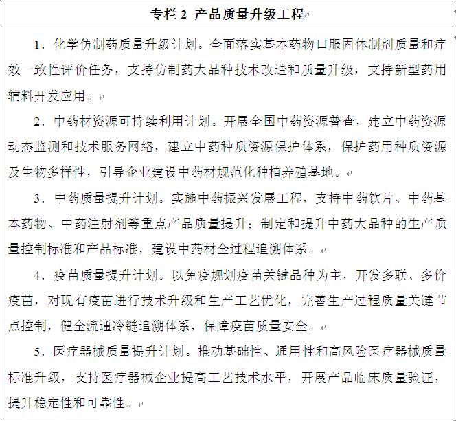 质量主体责任,健全质量标准体系,严格质量安全监管,促进化学仿制药等重点领域质量提升。