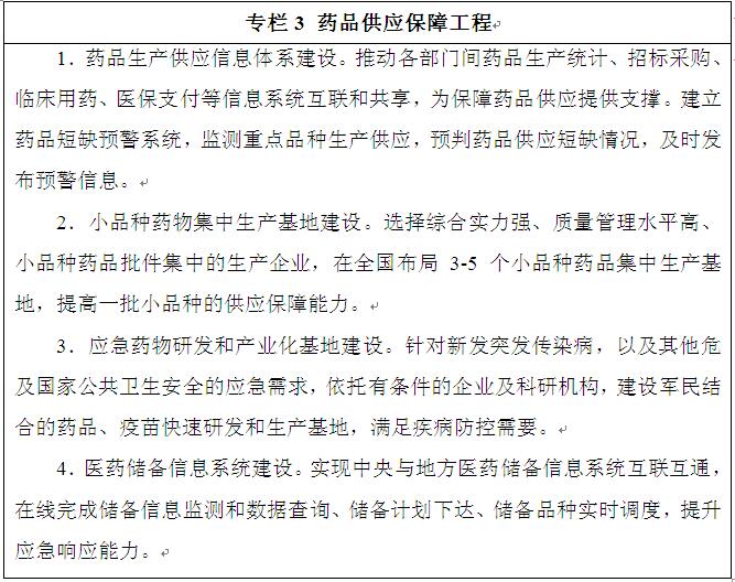 ——供应保障。国家基本药物、常用低价药供应保障能力加强,临床用药短缺情况明显改善,临床急需的专利到期药物基本实现仿制上市,国家医药储备体系进一步完善,应对突发公共卫生事件的应急研发和应急生产能力显著增强。