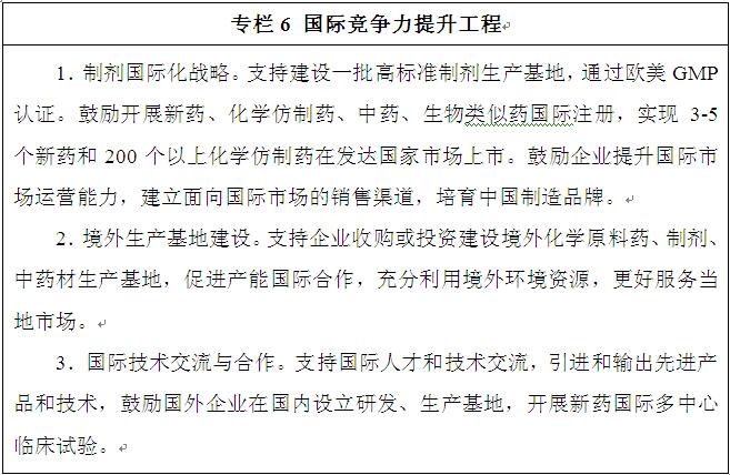 优化出口结构,促进出口增长。巩固化学原料药国际竞争地位,提高精深加工产品出口比重,增加符合先进水平GMP要求的品种数量。立足原料药产业优势,实施制剂国际化战略,全面提高我国制剂出口规模、比重和产品附加值,重点拓展发达国家市场和新兴医药市场。扩大医疗设备出口规模,借助我国电子信息、装备制造产业基础,培育医疗设备产品的竞争力,建立境外技术服务网络,大力开拓国际市场。